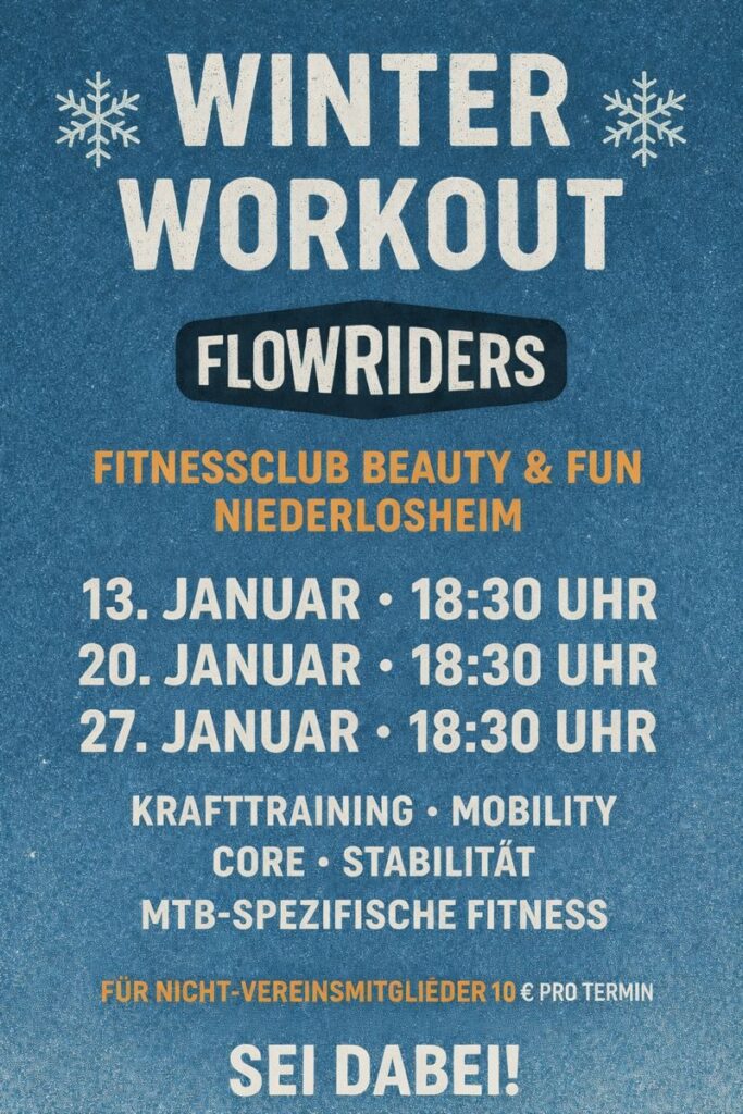 Wir halten die Off-Season aktiv und starten gemeinsam in den zweiten Trainingsmonat. Im Fitnessclub Beauty & Fun in Niederlosheim erwartet euch ein abwechslungsreiches Programm, das perfekt auf die Anforderungen des Mountainbikens abgestimmt ist.